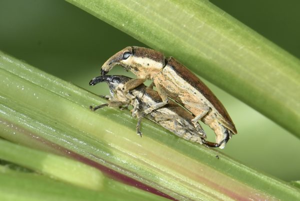 Les Curculionidae, ou charançons, constituent la plus importante famille du règne animal en nombre d’espèces. Ils sont facilement reconnaissables à leur rostre en avant de la tête qui porte les antennes coudées et terminées en massue. Ils se nourrissent de végétaux, feuilles, tiges, racines, graines grâce à leurs mâchoires situées à l’extrémité du rostre.